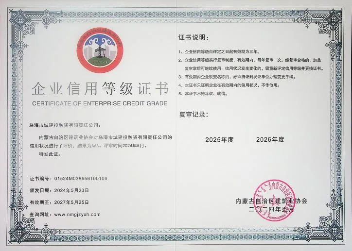 近日,經內蒙古自治區(qū)建筑業(yè)協(xié)會評選,烏海市城建投融資有限責任公司成功榮獲《2024年度內蒙古自治區(qū)建筑業(yè)AAA級信用企業(yè)》稱號。此項殊榮的獲得,是對城建公司長期以來在建筑業(yè)領域誠信經營、規(guī)范管理的充分肯定。