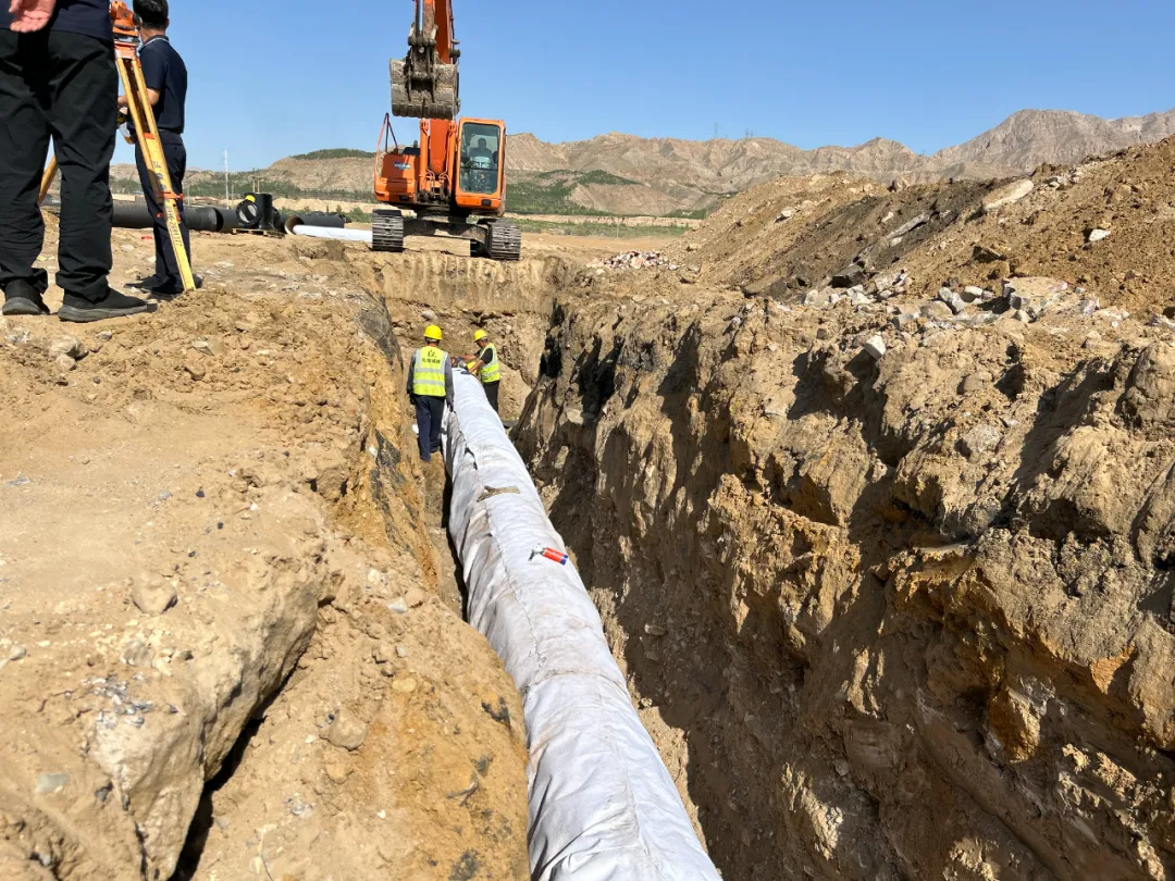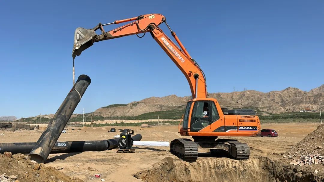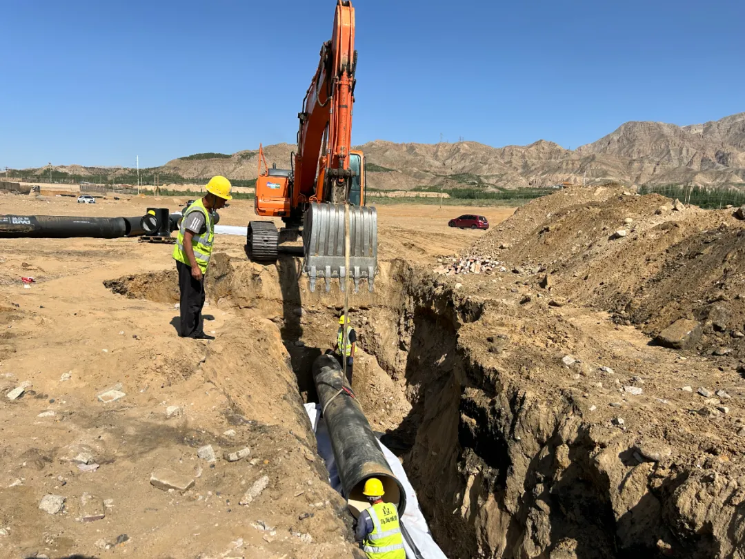 近日,記者在海勃灣區(qū)的南部凈水廠輸水管道項目現(xiàn)場看到,隨著挖掘機緩緩升起,一根長約6米的給水管被緩慢放進坑道。隨后施工