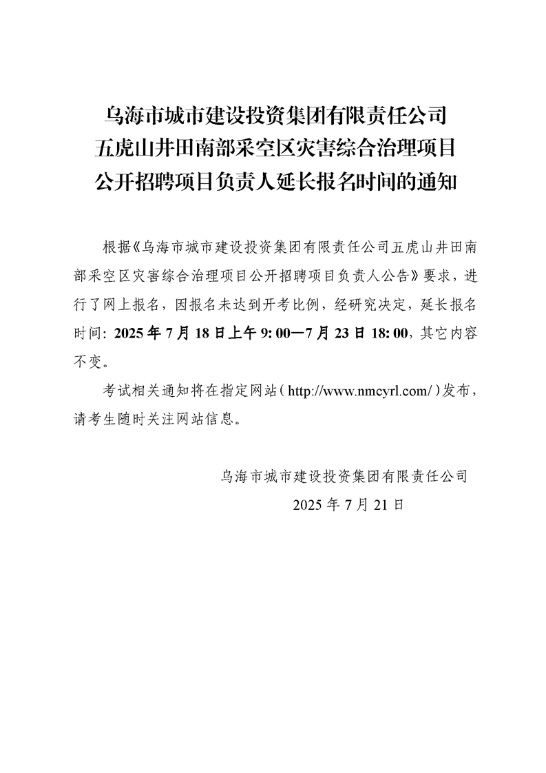 烏海市城市建設(shè)投資集團有限責(zé)任公司五虎山井田南部采空區(qū)災(zāi)害綜合治理項目公開招聘項目負責(zé)人延長報名時間的通知